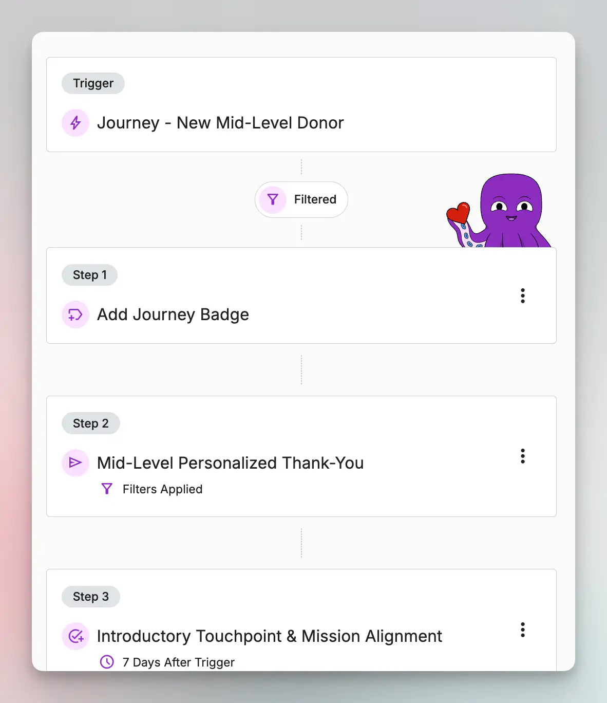 Design a mid-level donor journey that balances automation and personal touch. This is where tools like DonorDock's automated donor journeys become essential. You can't personally call 50 mid-level donors every month. But you can create systems that prompt you when it matters and automate the routine touches.