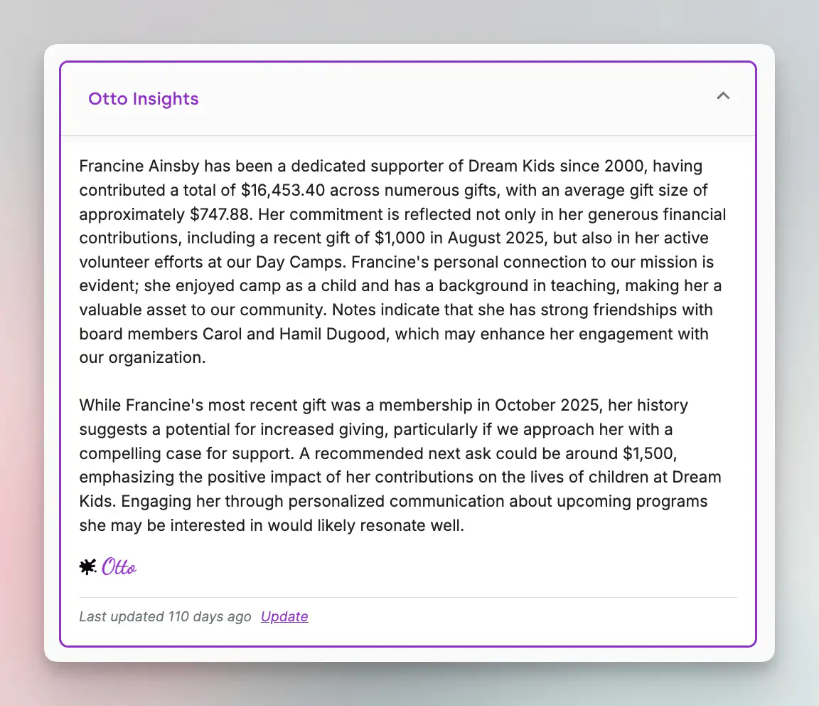 Scenario 2: The major gift prospect. You're meeting with a potential major donor tomorrow. Instead of spending an hour reading through every note, you open her record and review Otto's summary: "Major donor prospect. Lifetime giving: $15,000 over 8 years. Family connection: daughter attended program 2019-2021. Board member referral (Janet Smith). Expressed interest in naming opportunities at 2024 gala. Prefers quarterly impact reports to frequent emails. Strong relationship with program director. Recommended action: Discuss legacy giving and potential capital campaign involvement."
