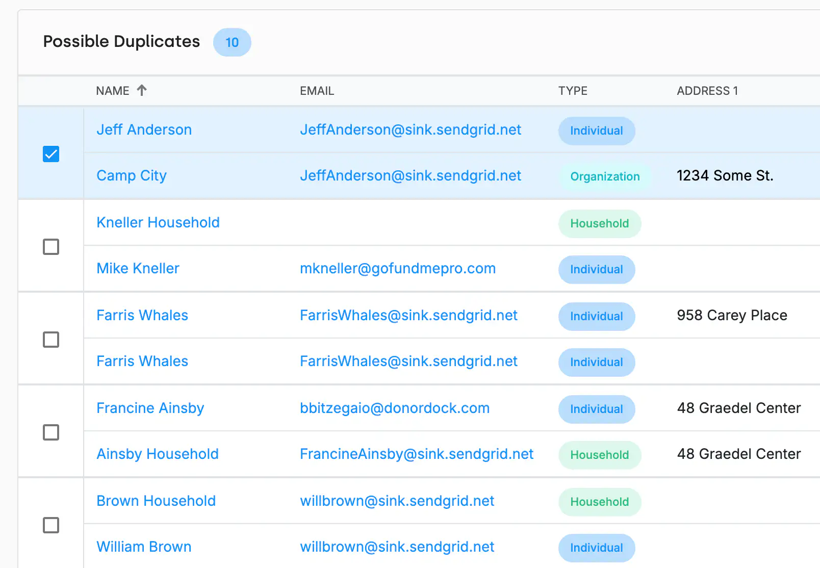 DonorDock compares contacts by name, email, phone, and address to find likely matches. The system suggests duplicates for your review — you always make the final decision.