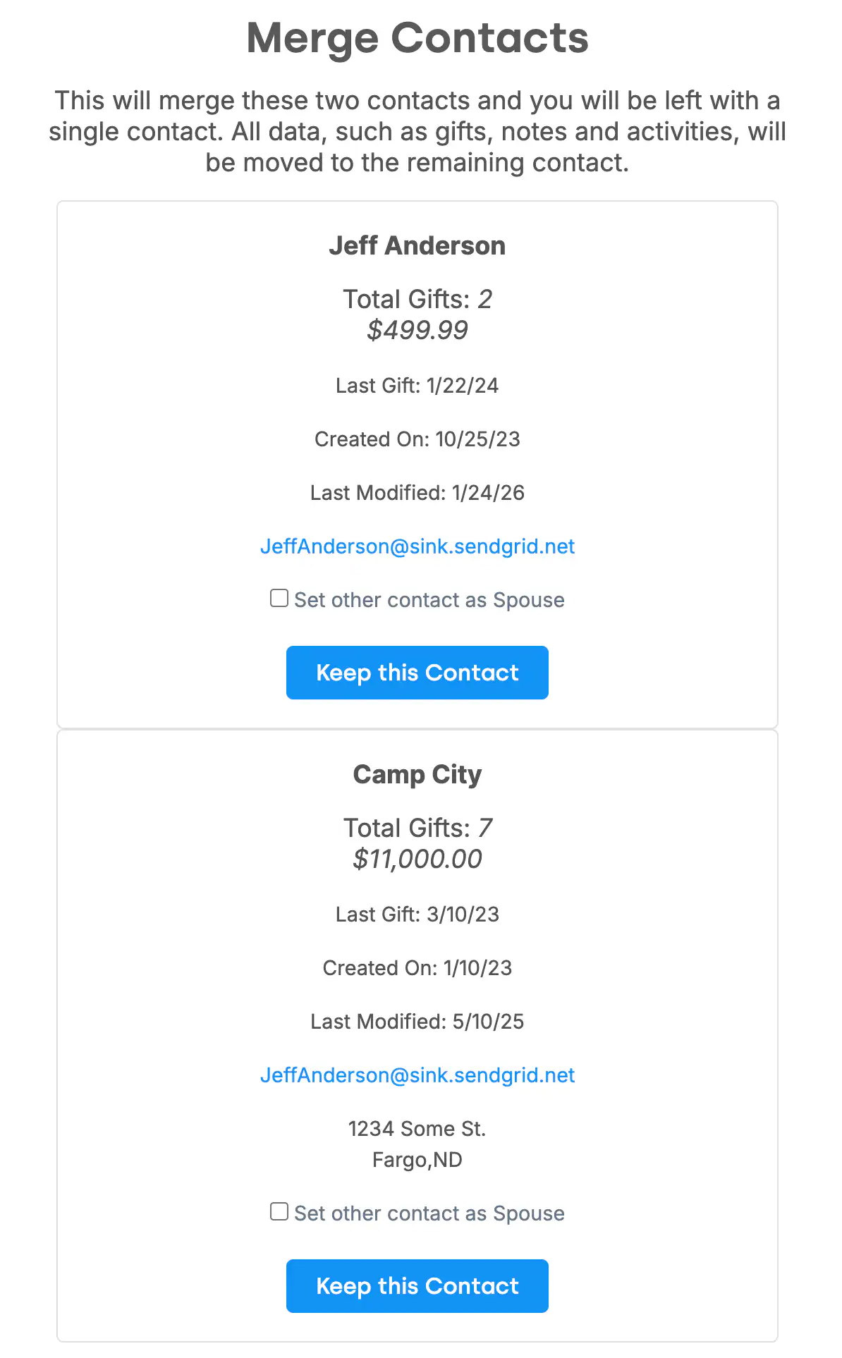 When you merge contacts, nothing is lost. Gifts, activities, notes, badges, and custom field data from both records are combined into the surviving contact. You choose which name, address, and email to keep as the primary — DonorDock handles the rest.
